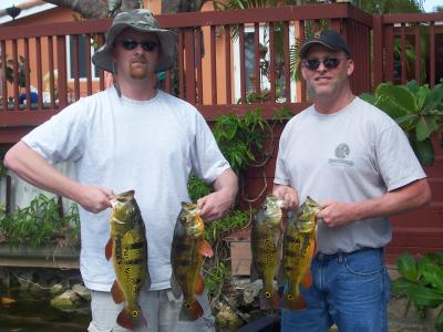 We hit Sonias seafood restaurant on the water for lunch. I had the jumbo shrimp cocktail appetizer and the Alaskan king crab for my main course. WOW! The guys had some calamari for appetizers and the grilled grouper filets. After lunch we drove the boat back to the lakes for a while and landed another half a dozen peacock bass up to about 3 pounds. We were about to head in and Dave has about a 20 pound tarpon smash a shiner right at the boat. This fish was so hot that it almost jumped in the boat. If I had the net in my hands I could have easily netted the thing as it jumped easily 6 feet in air. However just as fast as the sliver king was on he broke that 10 pound test line and he was on he was off again into the deep. What an awesome trip!