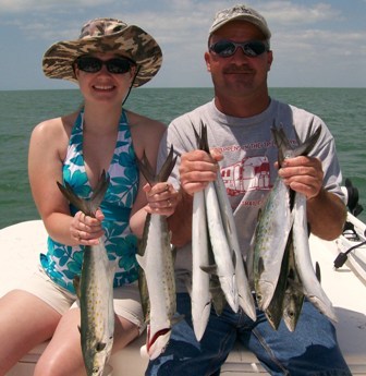 Just ask Kovee and John Schutt of Ocala, FL who spent a recent day fishing with Red Hot Fishing Charters. After a fairly good Speckled Trout bite, where we boated over 20 trout for only 6 keepers we managed to chum in some of the speediest fish that swim in the Gulf, the Spanish Mackerel. If you have never been Spanish Mackerel fishing before you're probably missing out on one of Florida's most underrated inshore light tackle game fish. When a Spanish Mack grabs your bait it's already off to the races before a hook can ever be set. Just ask Kovee who missed a handful before she proceeded to put on a clinic by catching and releasing over 35 Macks in a matter of 2 hours. John on the other hand caught his fair share of Macks as well but he and I were definitely more interested in the nice sharks that kept cutting in and out of our chum line.