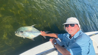 John fished with me last year and wanted to catch his first permit but bonefish as a back up, we caught bonefish. Today the mission remained the same and under perfect conditions feeling more like fall each day we found a ton of permit. Big permit, medium permit, small permit, permit everywhere. There was one problem, they were being permit and extra picky today. We lost count of the schools of permit of all sizes we saw and John made some very good casts where the crab would land in front of the school, they would swirl all around it but not eat. So frustrating! As the tide slowed so did the fishing so I took him to another spot. Here the tide was "running late" but we still had good current. I told John we had the perfect amount of water for permit at this spot but there would be more bonefish than permit, I was hoping the fish wouldn't let me down. About 15 minutes into fishing this spot John hooks a freight train and a long fight later requiring I chase the fish, John had his bucket list fish at the side of the boat, a big permit. Yes!!!!! We fished the same spot for the balance of the trip and he proceeded to land three bonefish. What a way to end the trip and be part of John catching one of the last remaining fish on his bucket list. Way to go John!