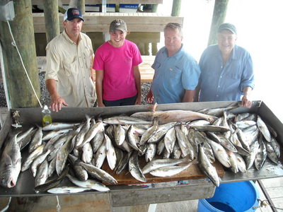 Sam, Charlie and Keith along with Megan Keith's future daughter in-law were ready to go get into the trout. We ran straight out to the rigs and made a one stop shop. Megan was red hot she had 10 trout in the box before anyone else even had a bite. The bite was not crazy but steady they would turn on for awhile then off then back on. Live shrimp 4 ft under corks was doing the best. Live croakers were a little bit bigger fish but not much and the bite was a lot slower. Sam and Keith were trying to catch up wit Megan and Charlie was just taking his time enjoying it and pulling in some nice trout at his own pace. By 10:30 there was 100 trout 1 to 4 lbs on ice and it was getting hot so we stopped twice on r the way in and topped off the box with 3 redfish. AWESOME DAY! The guy's said it was Megan's pink crocs and shirt but she said it was all skill.HA!