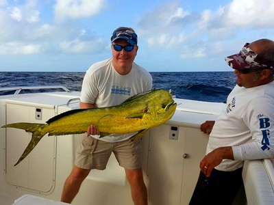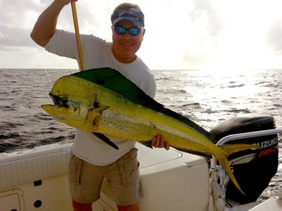 As we reached the edge, I felt that something wasn't right. Crap! There was only a trickle of current to the north and the seas were too calm to suit me. As it turned out, the conditions were not right for the fish either. Oh boy! We'll give it a valiant effort, regardless of the circumstance. About 30-45 minutes passed and we finally had a fish come in. The fish ate the right rigger and Jon was into a decent little "eater" Dolphin. Nothing out of the ordinary happened during this struggle, just as we had expected, because Jon is an accomplished angler.
