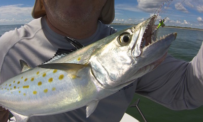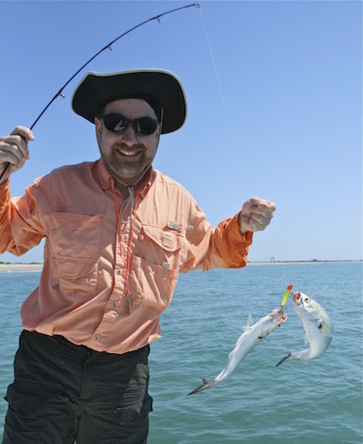 Friday- Scott Radloff joined me for some fishing along the beach out of Port Canaveral. The weather was hot but otherwise awesome. Early there were large numbers of fish near Cape Canaveral- bluefish, Spanish mackerel, ladyfish, and crevalle jacks. They were feeding on glass minnows. We did some damage with the 3/8 ounce Sting Silver from Haw River Tackle. I pulled out a seven-weight with a sinking line and a simple bucktail streamer and did some more damage.