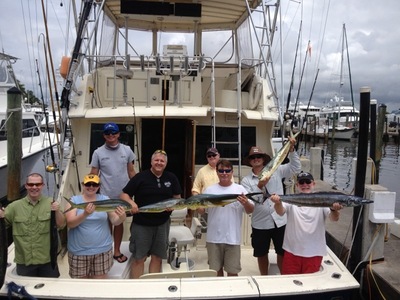 Captain David and mate Jake made the most of improved fishing weather today, loading the Lady Pamela IV with a bunch of game fish. They started the morning working the reef in 100 feet of water, producing some nice kingfish. Captain David then caught word over the marine radio of a nice color change offshore Ft. Lauderdale so they pulled in the lines and went looking for the break in water color. The brownish-green coastal water turned to a deep purple out in 900 feet of water, associated with a slight current rip. As soon as the lines were back out a 20 lb wahoo slammed one of the baits. This was no monster wahoo but it put up a pretty darn good fight. Jake had just boated the wahoo when the reels started singing again. This time it was gaffer dolphin in the 10-15 lb range. Our anglers had more than a dozen hookups, putting five nice fish in the box.