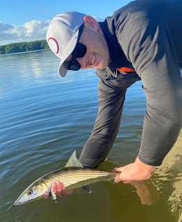 Jake, oh Jake! He couldn't have had a better day and he couldn't be a nicer guy. Jake booked me at the last minute for today and wanted to fish for bonefish. Well, we did but I started off with "It's been really good but not great yesterday.". Then, Biscayne Bay made me eat my words by providing Jake with 13 bonefish landed and 15 hooked in total! Crazy for a half day! It started off slow, or at least I thought because I wanted quick redemption, but it really didn't. Within the first half hour Jake landed his first bonefish and then kept coming in the boat until the tide slackened. Once the tide picked up again Jake was hooking up on almost every cast! We literally left fish biting as I asked if he wanted to make a few more casts but he had to go. Wow!
