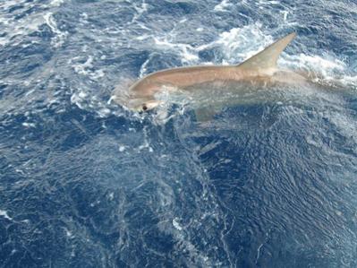 Today we had five on a shared fishing charter, a group of three and a couple. We headed out the inlet and conditions were perfect for live bait kite fishing. In 300 ft of water, there was a rippin' north current on the edge. Rusty, our new mate, assisted Mike in the cockpit, flying the kites and getting the Shark baits positioned down deep. We waited patiently and it was all worth it in the end. After an hour of soaking our baits, two Sailfish jumped on our live bait, a Hammerhead Shark ate and then a Silky Shark swam in and took a bite, ALL at ONCE! It was the craziest thing I have ever seen. One of the Sailfish managed to release itself but Mike, Rusty and our anglers managed to catch the remaining three fish. The Sailfish and both Game Sharks were released back into the blue and we went on our way with trolling gear in the water and many smiles. We ended the day catching 10 King Mackerel and 4 Blackfin Tuna.