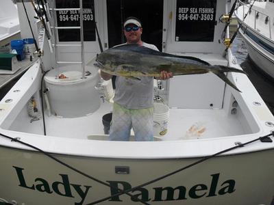 Fishing in Fort Lauderdale was great today. Jimmy and Sarah, from Jacksonville, set sail aboard the Lady Pamela II while Mike, from Delaware, joined the Lady Pamela I. Both boats left Lauderdale Marina at 8 AM with high hopes of hooking up with the last bit of the Sailfish Fort Lauderdale will see until the season kicks off again. Captain Paul and I ran the Lady Pamela II to 300 ft of water and popped the kites into the air while the Lady Pamela I trolled the reef. After an hour of waiting and wishing for the bite in 300 ft of water, I moved the boat around and the mid bait in 150 ft of water got a hit. Jimmy landed a Hammerhead Shark and a nice size Mahi for good measure aboard the Lady Pamela II. The Lady Pamela I came back to the dock with a 4 Mahi - Mahi, one 30 lb'er and 2 King Mackerel; looks like Mike will be eating good tonight.