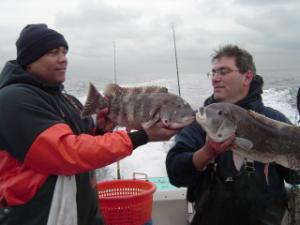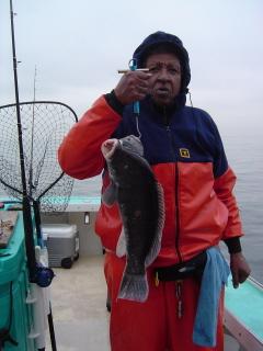 Today we had an open boat trip with 5 anglers and fishing was very good . Victor (learningtotog) was HH with 12 keepers (retaining just his limit) he had 2 fish in the 9 lb range weighed for the tog tourney his others were all between 5 and 8 lbs. I wasn't out today but Victor will post his official weigh in form with the exact weight. Donald also limited out wit a pair of 10's and a few in the 7 and 8s. Pat and Lewis had 10 between them and patty had a nice 9 with his catch of 5's and 6's. Norio had 3 and Capt. John also had 3 . All the drops had life and greens were just as effective as the whites.tally on togs 38 and we also had over 2 Dozen fat ling today.