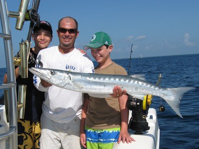Devon reset and we trolled north a bit then crossed over to go south. After 10 minutes I crossed back over to go north on the other side again. 15 minutes without a strike and I got the word that little Mike and Shane were bored. Wow! The Xbox/PS3 generation is so spoiled by the instant gratification of video games that they have no patience. This is no reflection on little Mike and Shane. This is not the first time we've had young boys complain of being bored if they aren't bailing fish one after another. Mike asked if we could go catch some little fish that would be more action for them. I suggested we do a wreck and at least they could get some bigger 'Cudas that would impress them while keeping them busy as well. So we put the Dolphin gear away and broke out the down rigger and live bait.