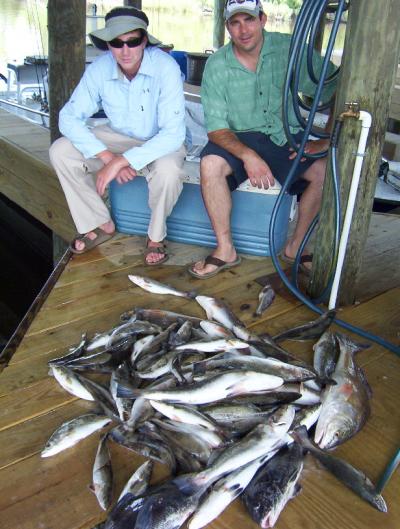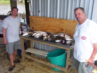 Friday thru Monday we had some really good fishing in Hopedale La. Every day was different and the fish in different spots each day. We had four boats out every day and Reds and Trout were piling up on the dock cleaning tables every afternoon. We got some live shrimp Friday and Saturday and the trout just ate them up like candy, but the bait shops were empty Sun and Monday. So we reverted to plastics for the trout and dead shrimp on the shorelines for the redfish. We had several different groups of great people and had a blast pitting them on the fish.