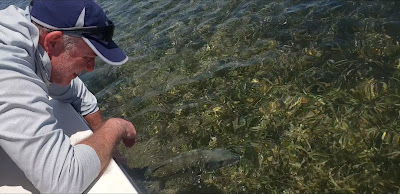 I really needed this one. Two years ago David fished with me and got a bonefish. Today we were on the hunt for bonefish and permit under ideal conditions. But, I have to admit, I was still haunted by the big bonefish we lost on Monday so I was eager to make up for it and kick off my 4th of July weekend on the right note. David brought his friend Jeff and I took them to a bonefish and permit spot but the tide was really high for bonefish. Part of the issue was that I was running an hour late because of the number of boats trying to launch in the morning. Just crazy! Anyway, we saw some bonefish schools but they were too far away so off to spot 2 where there were some bonefish but many more permit. They had a bunch of shots but the permit were trickier than usual so off to spot three. That was the magic spot as I was able to locate a number of schools of big bonefish tailing and mudding in a foot of water. One school moved up and started feeding and moving to the left. David make the perfect cast and the school moved over his shrimp. As it unfolded I saw a fish tail on his shrimp, a puff of mud and a screaming drag. Yes! I had to pole after the big bonefish that was making a really long run and then it turned toward us and wrapped around one of the PowerPoles. Oh no! I was able to work a miracle and free the fish and moments later David was holding the big bonefish in his hands. Wow, what a relief and he just got a bigger bonefish than last time. Cool! We ended the day with a few more shots for Jeff and then headed back to the ramp. What a great day, great weather and great guys! Happy 4th of July!