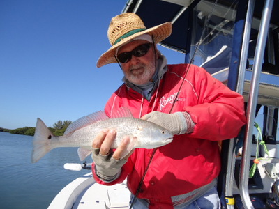 The tide had risen from .8 to 1.6' and it was redfish time. Shrimp on a 2/0 circle hook with a small sliding sinker quickly brought our first red into the boat. Over the next 2 hours red after red inhaled out shrimp. The reds were very aggressive and while not big redfish the fight on light tackle was fun.