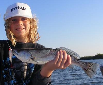The weather has been perfect so far this October 2010, we have had some more great fun fishing trips the last couple of weeks. On one of those trips with my regular client and old friend Lorin from Deland, Florida along with brother Mark and friends Chuck and Charlie, we caught a total of 11 Redfish up to 26" and about 10 Seatrout with most of them in the slot which is 15" to 20". Pictured is young Charlie with his first Redfish. On one of my Indian River mixed bag trips this week Rick and his son Ethan caught no less than 50 small Seatrout and Ladyfish on fun light spin tackle. The other picture of Ethan and one of the Trout.