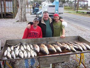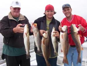 Don Luedke brought his son Evan and grandson Zack down to sample some Louisiana REDFISH and SPECKLED TROUT action. Well the foggy conditions had the guy's driving form Miss a little late but no problem. Don wanted reds so reds it was to be. First shoreline we trolled it didn't take long and the drags were a running. The gold spoons and some TOP WATER action too was doing the job. Before long we had a bunch in the box. Don said that was enough and wanted to catch and release and maybe get few trout too. Well changed up and fished little off the bank and had some nice 3 lb plus trout to top of the box. We caught fish all morning long. The guy's put 35 reds in the boat only keeping 11 for the grill along with 20 fine trout and I lost count on the ones released. Awesome day Don said he will be back for sure.