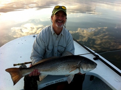 Friday Dr. Bud Robertson joined me for some fly fishing on the Mosquito Lagoon. I always enjoy fishing Bud, whose motto is "Success happens when opportunity meets preparation." He was certainly prepared for the first shot he got, nailing a 36 inch red that ate his Puglisi streamer, less than 30 minutes after launching the boat. He also got a 30 inch red and another smaller fish.