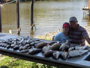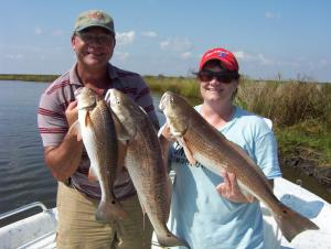 Sal and Wife Evelyn had a knock down drag running day today. Started out with the speck's under the birds. Evelyn was flipping them in left and right she said she had not been fishing in over 10 years WOW I can't even imagine that. Well Sal was catching'em too the trout were nailing plastic under corks drifting over some flats. With almost a limit on ice we wanted to get Evelyn on some reds. Man was she on them we all were Drags smoking line stretching big reds. Hen it was all said and done they had there limit of reds and caught and released 12 more. With their arms aching from the bronze brutes we finished out the limit of trout and headed in. Well she got 10 years worth in a day.
