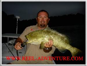 Or did it? 2 weeks later a friend of mine Jason Todd, from Charlotte flew in and a Everglades trip was quickly concocted and the next morning we were off. 2 hours of early morning driving and we were leaving the same ramp, at the same tide, it was about a half hour earlier and it was still dark. We rig up the Gulp jerk baits and get to our first spot. I was up all night thinking about "the one that got away" and I knew were my first fishing location was going to be. I was after revenge but was sure I was going to be let down as usual. At this point I shared the dreaded "the big one got away" story with Jason as I made my way to the magical point and brush pile. I made sure it was going to be my third cast once again, and for some reason that seemed important. I cast and put the pearl white jerk bait right on target, and just the same as 2 weeks prior I was once again attached to something on the other end of the line that clearly did not want to be there. I excitedly set the hook way too hard and the drag grunted while the fish began the violent surges and head shakes, just like last time. The game was once again on. The fish went straight into the brush pile just like it did weeks before. I swear it looked like a bull ran into that pile, because the entire pile of brush seemed to come alive. Remembering my trolling motor dilemma from before I hastily urged Jason to crank the outboard and take me to the brush pile. He was right on cue and time was of the essence! I knew if I lost this fish this time I was going to be in need of therapy! As we motored to the pile of brush there was a point in which a little less pressure was applied to the fish and he slipped right back out of the brush pile the exact same way he went in. He quickly realized his mistake and surged for the pile again. I palmed the spool with easily enough pressure to part the 10 lb Spiderwire braided line but it held true. I now had the beast in open water and up to the surface it came. It was a 27 inch Gag Grouper and Jason was a pro with the net and got it on the first scoop. Here we are in pitch dark, looking at each other with this Grouper on the deck of my flats boat wondering what do we do now! Neither of us expected for it to be a Grouper and I never in my entire life expected to come back to that exact same spot in the Everglades and catch "the one that got away"!