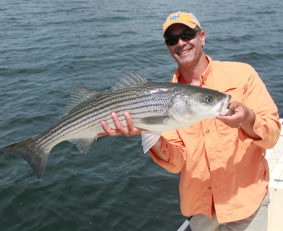 The bluefish are running anywhere from as big as your foot to as long as your arm. The stripers are pretty consistent in the 22- 26 inch range with a few going even bigger. Both species are hitting topwater plugs and flies.