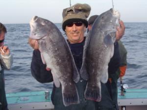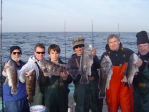 Today we had a charter for Gil (aquahoilc) and his guys. Gil and all the boys were awsome everone had a blast catching some really nice tog to 9lbs. Then releasing 30 some odd Striped bass at the end. One was even a keeper But alas the season is closed so it too was released. Dan had the pool with a 9lber in his limit catch along with the released keeper Bass. Denis (longhunter) had 6 Fish Kris and Chris each had there limit and Gil and warren had 12 0r 13 between them . Capt John had 3 and Many shorts were released. Fished a little deeper but Whites were still the ticket. Many quality fish in the 4 to 6lb range came over the rails today.