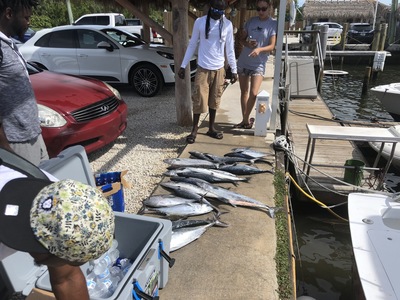 Inside 150 feet there has been a ton of bonito around. Along with bonita we are getting smaller kingfish about 7 to 10 pounds. Trolling planers with sea witches has produced best to get baits deep to where the fish are holding. Just check out our group here with a cooler full of fish before we hit the filet tables.