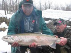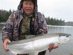 I was guiding Ron and Joe; Barkley was guiding Jeff and Mark. Boondoggin along Jeff hooks a monster, the pic is attached in this photo 29 length by 21 girth, then another 4 more in this pool himself, the other guys quickly start casting, another 5 fish are hooked in this pool, it was a good run of fish. Also attached is father Ron with a chromer hen, who also landed today a 39 inch Steelhead. I will keep this report short as we are in full season and I will be busy on the water, tight lines.