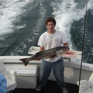 This last weekend I had a group from Boston in the city itself. They had come see how good the fishing in the bay really was. Michael and Mario DelMonaco, Joe and Anthony Cappuccio, Joe Wright, and George Gleason fished the full day trip out of our harbor. The fishing was good, not gang busters, but good. We landed a good number of keepers, a number of small bass, and a good amount of bluefish. All the stripers were taken on the jig while some of the bluefish were landed using the hootchie in the outriggers. Because of the boat traffic we didn't use the riggers that much. Anthony Cappuccio landed the biggest bass he'd ever caught. It was a solid 25 pound fish. It wasn't the biggest fish we caught that day, but it was his biggest and that's what counted.