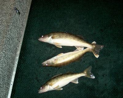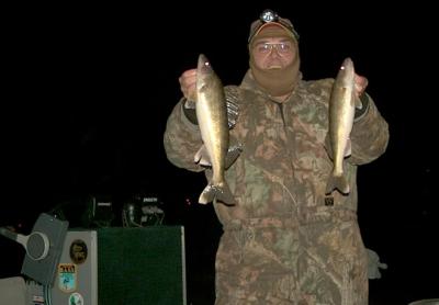 Another thing that's happening a little more this year (or at least it seems to me), is the walleyes willingness to bite artificial offerings being jigged, versus jigging with real minnows. All the walleyes I caught in my short 2 daylight hours of fishing on the river yesterday (11-10-07) were all caught on plastic. Actually it was within 1 hour, as I jigged with real minnows for the first hour and never caught a walleye. With how hard good bait is to find anymore, this trend might be exactly what the doctor ordered, at least for river fishing. Even tried some night trolling. But it seems the night trolling bite hasn't started up near Saginaw yet for some reason. But getting back to the plastics. This new 10 pac of plastics I picked up for jigging from Franks yesterday called "Realistic Minnow", made by Berkley Power Bait did the fish catching job quit nicely for me. The color/type was Smelt, and the length was 3". Another great choice is the 1/4 and 1/8 ounce "Mimic Minnow" in perch color, made by Northland Fishing Tackle Company. Keeping either of these offerings "short hopping" along bottom on a tight line has been killer for a few of my closest friends (and now me) when fishing the river. Of the 6 keepers I caught yesterday, here's a picture of me and the 3 I kept for the dinner table. Also included is a picture of 2 buds who were also pulling off the river at the same time as me, and who also kept only a couple from their 6 fish catch. Please, never keep more then you will use?
