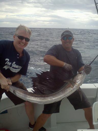 Our first fish were Mahi Mahi's from the kite, as we wound up with four Mahi Mahi's and two Kingfish. From there a sun shower popped up, so I decided to do some trolling. My favorite places to troll are over some of our 34 artificial wrecks in Fort Lauderdale FL which are in 60 ft. of water out to 420 ft and from 30 ft. barges to 500 ft. freighters. With four Ballyhoos out and two plainers, I trolled from one artificial wreck to another, catching a mixture of four Tunas and one Barracuda. Then the black shadow appeared on the left long Ballyhoo as the bill and dorsal was out of the water frantically chasing the bait and finally capturing it. The fun began – the Sailfish came out of the water to do his acrobats and show his fantastic power and colors. Fifteen minutes later, Kevin brought the Sailfish to the side of the boat as Mark, our mate, billed the fish for picture taking and was released to fight again.