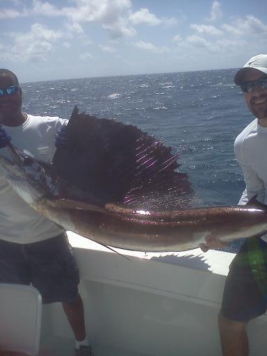 I went back to the same place to set up the two kites; another Hammerhead Shark appeared and fifty minutes later was brought to the side of the boat – this Shark looked like the twin of the first one – pictures were taken and released. Same set up – this time another black shadow appeared – a Sailfish ate the bait from the left long and swam off, taking with him ¾ of the line off the reel. As I backed down on the fish, a little boat was approachin,g and even though we screamed, yelled and blew the horn, the boat paid no attention, kept going and cut the line on us. With disappointment, we went back and set up again. Right Short!!! Black shadow again! Sailfish hooked up! The Sailfish was brought to the boat, pictures were taken and released.