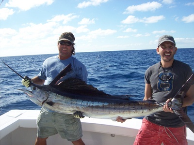 Sailfish are moving down the edge of the reef and we are catching them. Most of the sailfish have been caught on live bait. Some of the best choices of bait have been live Ballyhoo, Cigar minnows, and Blue Runners. Most of these baits are slowly trolled on the surface to entice a strike. On windy days the kite method has been used with great results. Common baits used on a kite rig are live Goggle Eyes, Blue Runners, and Threadfin Herring. The kite idea is very effective because it constantly holds a bait fish near the surface in distress. The distressful noise/vibration is what triggers a feeding reaction to predator fish.