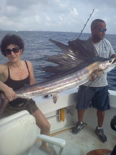 We put out two kites with two live Goggle Eyes from each kite. An hour passed by and our black shadow appeared on our left long. The Sailfish was not interested in feeding and so it kept migrating to the south. A short time passed and another Sailfish appeared on the left long. All of a sudden the dorsal fin and bill was out of the water chasing the live Goggle Eye in circles. The Sailfish finally succeeded in eating the bait and the fight was on!!! Maria was the angler. The Sailfish tail-walked on the water, with the sun's rays shinning off his beautiful neon colors. Twenty-five minutes later, our mate, Jackson, brought the Sailfish into the boat for picture taking and then it was released to fight again.