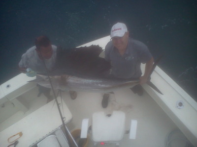 Clean water all the way to what seems like the beach as of late. A strong northerly current and couple those two with some wind out of the north, which we have, and sails are up and surfing their way south. Tailers being seen and fished in water from 75 to 150 of depth. We have been blessed with a lot of sun around those scattered showers and when that sun is out these fish are very visible. Mostly good sized adult fish this time of year. These conditions won't last for long and being on the back side of peak Sailfish season we are happy to have this happening right out front of our inlet. Live bait is as expected the key to success when these fish are moving like this. Many will bite but some will refuse with the barometric situation early on these fronts. Some fish seem as if in a trance and although they color up when they see the bait will move on. But but some take that look and then bite as well. Measured taking of the bait, few crash bites, and then they resume that southern direction only to often turn up sea and north when hooked. Nice fish pictured with Bob and 1st Mate Dave aboard Marlin My Darlin prior to release. Good fun and memories. We will catch them all year but Sailfish catches taper off as we move into Spring and summer.