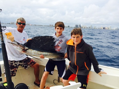 With the cooler weather finally here in South Florida we are all set for the expected push of Sailfish in good numbers that we have been waiting for. The warmer weather has held up their southernly migration with the exception of singles, an occasional double and a very few small bunches of fish. We have been picking away at them but are ready for the increase of fish into our area. The fish have been stacking up far above us and this weather should get them on the way. Pictured are a couple of our young anglers that fished with us on the Marlin My Darlin with this treasured early season single fish, a loner who ate a live Goggle Eye fished off a kite. Not pictured is Mr. Frank, the money man and photographer, who is responsible for the charters we have had with the boys here in Ft. Lauderdale. That is Frank's son Hayden closest to the fish. Nice quick picture and a healthy Sailfish returned back into the ocean.