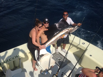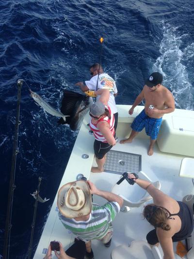 The Lady Pamela II had a great group of anglers onboard today that we met at the recent Safari Club International Show. They joined us for a fun six hour trip off Ft. Lauderdale yesterday. We went three for three on sailfish in the morning, and in the afternoon we caught a monster amberjack. There have also been a few dolphin and wahoo around. The sailfish bite should be pretty good over the next few days following the cold front that just came through today.