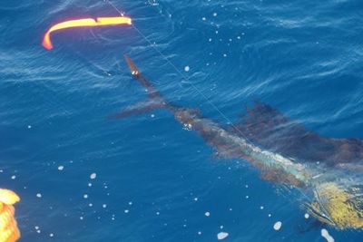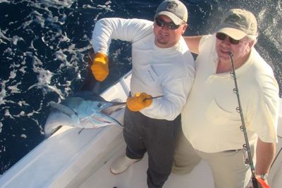 J.J. decided to treat it as if it were a sailfish. After a few seconds of just letting the fish just walk away with the bait J.J. locked up the reel and started reeling as fast as he could as I went ahead with the boat.