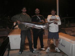 Last night I took another trio of Swordfish virgins and the seas were flat calm and the fish were snapping. We had one heck of an evening. The first drift showed a whack of the bait and then the bite. Within seconds the fish pulled the hook. As we were clearing lines to pick up and reset for another drift a nice fish followed the baits up to the surface and we had him swimming in the Hydraglow light. Here are 4 of us trying to bait this fish up and my daughter Amy, who mated fro me on this trip gets her bait whacked twice but not eaten. She quickly dropped it down 50' to see if the fish would follow to eat and sure as the sun will rise, the fish eats it and hooks up. This fish lasted about 2 minutes and in the glow of the lights we watched ans he violently shook his head and the hook ripped free. We had 2 more fish bite and for some reason the guys were having trouble hooking up. Finally, the deep tip rod goes off and we are solid into our fish. The fish running straight down and under the boat and the angler pulling skyward on the rod, hyper-flexing the tip, and crack goes the rod. I told him to remain calm keeping mild but steady pressure on the fish while leaning the rod to the side. Believe it or not the fish came to the surface and we stuck the gaff in it. A nice 52" fish about 65# and another loses his Swordfish virginity. The weather started to turn as a mild front began to push in the area and light rains were pushing in. We had the tip rod go off one moe time resulting in a no hook up and we called it a night as the winds changed directions and started blowing. A very nice trip with very nice guys and the Swords kept us active most of the night.
