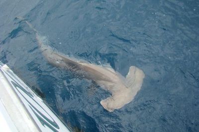 It was a big back and forth battle for over 20 min but @ last Mila hung in there and this big hammerhead shark was next to the boat. We got a couple quick photos and watched him swim away in good shape.