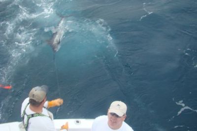 Toney jumped in the chair and the fight was on. At first it was just a gain a little line lose a little back and forth tug a war but after 25 min of this we realized that this was ether a monster sailfish or a fouled hooked one. As it turned out monster is just what it was!! (A 90-inch sailfish Holly @##$%) Now that's a big sail.