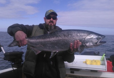 We have mostly been fishing salmon when we can get out. The winter weather is often a little harsher in Ucluelet than Victoria, especially since much of the water fished isn't quite as protected. On the days we can get out the Chinook fishing has been very good and we are not running very far to set our lines. Most Chinook are ranging in the 8-15lb range and are coming on small Silver Horde 3 inch or Coyote spoons. Green and Blue are classic colors and are consistent. Glow and UV needlefish hutchies about 20 feet from the bottom are also working.