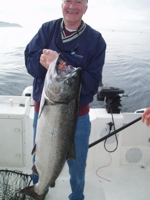 Victoria Waterfront – Fishing was VERY GOOD for salmon on the waterfront this past week. A fresh run of big springs arrived on Wednesday and fishing was excellent until the winds came up on the weekend. The winds were so strong that the Esquimalt anglers Annual Salmon Derby had to be cancelled due to concerns about boating safety. Most of the springs are being caught around the harbour mouth, the breakwater and Brotchie Ledge. Pink salmon are being caught near the yellow Pilot Buoy and Brotchie Ledge on the flood tides. Some are even being caught right along the breakwater too. The springs have been around 40 to 70 feet and the pinks from 50 feet to 120 feet on the downrigger. David Simpson did well landing a 33 lb spring on Thursday by the breakwater. Wayne Zaccarelli landed a 26 lb spring near the harbor. Most of the springs have been from 10 to 25 lbs in size. Anchovies have been the best bait and Purple Haze and Mint Pearl were the most productive teaser heads. Good flashers have been the Green/Silver Hot Spot and the Oki Betsy Gold Metallic flasher. Plastic baits such as Army Truck or Purple Haze hootchies fished behind White Glow or Purple Haze flashers have been catching fish too, especially if the fish are deep.