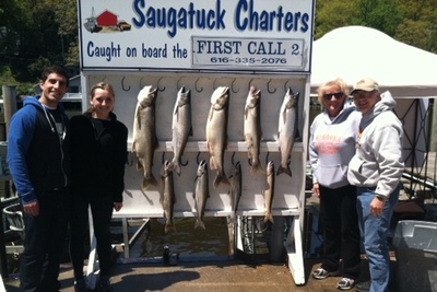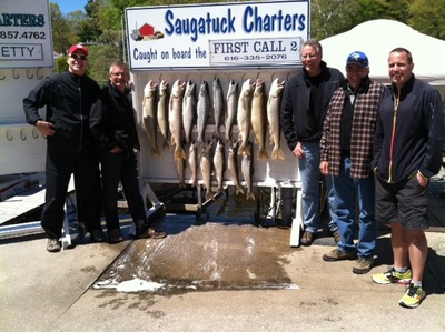 Excellent fishing this past week with 10 to 20 fish caught per outing being the norm. Once again we fished the 60 to 90 foot depth with lake trout up to 15 pounds caught in the bottom 5 foot and Chinook salmon and Steelhead hitting in the top 35 foot of the water column. The water is still cold with 50 degrees on the surface and 41 degrees on the bottom in 75 foot. Sunday some very nice Chinook salmon and steelhead were caught in 165 to 175 foot of water from Holland to south of Saugatuck. I also heard that Grand Haven charter boats found some nice steelhead out in 200 foot of water.
