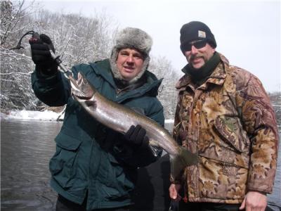 The Oswego river is running around 12,000, which is a good flow there. Browns and a few steelhead are being caught behind the hotels on white bucktail jigs, tipped with a minnow or worm.