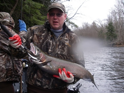 The fish are on the move so don't be afraid to move around. The salmon river is still running around 335 cfs but there is some run-off which really helps. The Oswego is high but fishing very well. Same baits, same colors.