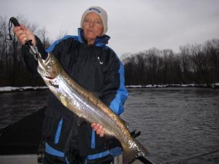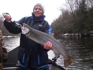 Note: Steve Zimmer truly has landed numerous steelhead in the 25 pound class on the river he fishes out west. This one though was his first on a pin. He is ruined!