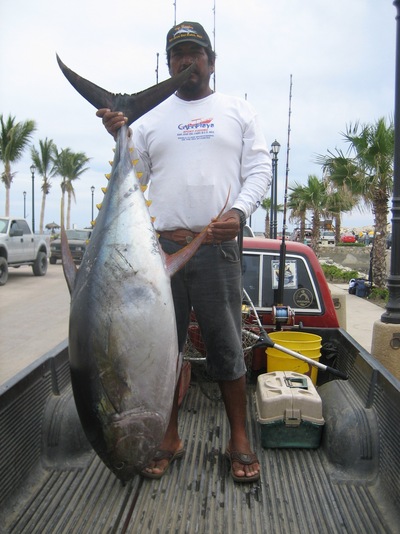 Anglers that did obtain live sardinas reported mixed success for yellowfin tuna in the 10 to 20 pound class. Catches ranged from two or three fish per boat, to as high as a dozen. The tuna would come up and be seen feeding on the surface, they would also unpredictably vanish. The larger sized yellowfin tuna are still lurking in the vicinity of the Gordo Banks, the famed local pangero team out of La Playita, Hugo and his son Agustine Pino, were key members of the winning team on the "Fisherman" during the recent WON Tuna Jackpot, when they nearly set a world record with a 383 pound yellowfin, the 150 pound tuna they landed while trolling a live bolito on Wednesday was a reminder that big fish remain in the area, several other tuna were hooked in by anglers chumming and drift fishing with chunk bait, most of these fish ranged 70 to 90 pounds, more charters were actually targeting the wahoo action to the north.