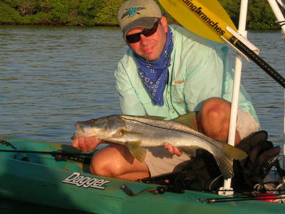 I found more of what I have been finding all over southern Tampa Bay and that is really big Snook. These fish are laid up along mangrove shoreline and depending on the tide can be found in three to six feet of water back away from the mangroves or pushed far up into the mangroves. I have been trying out a new Stand N Fish unit that allows kayak fisherman to stand and sight fish without the fear of falling in. It has made a huge difference in how many fish are actually spotted from a kayak while still retaining the stealth adavantages so loved by kayak anglers.