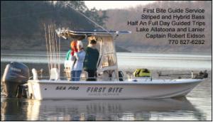 This striper and hybrid report fishing report has been brought to you exclusively by Robert Eidson of First Bite Guide Service, 770-827-6282. www.firstbiteguideservice.com Lake Allatoona, Georgia