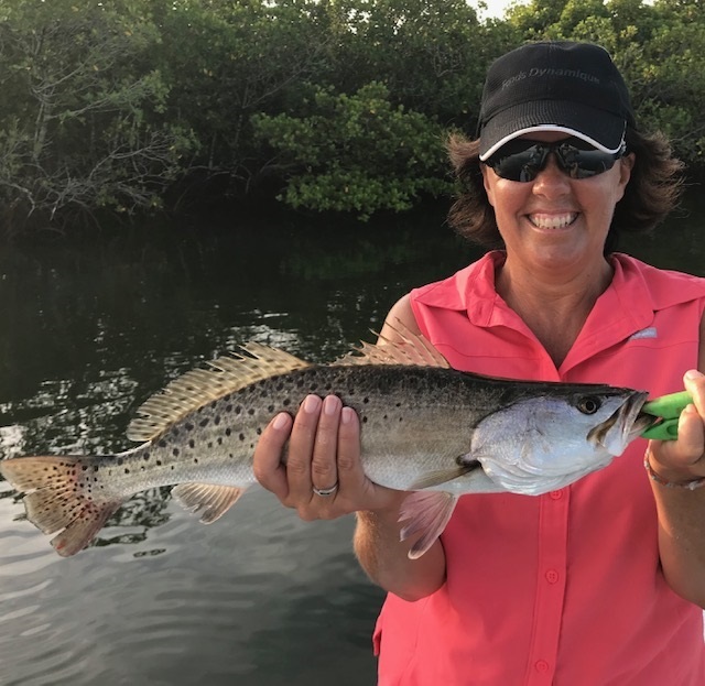 Repeat husband and wife clients from Canada were out with me again on a good Seatrout trip, Nathalie with her best Trout of the morning …………………