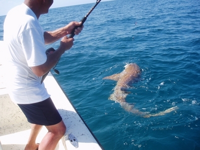 Mark Zisser and family from Missouri were visiting last week. Mark likes to book a few or more trips with me, as he has done for the last 25 years. One of the days I took Mark offshore 6 miles to fish some nice natural hard bottom. The bottom is surrounded by a two foot break that the grouper like to fan out and hide under. It turned out to be a shark day! It was shark after shark, all kinds, all sizes on light tackle; the largest was a nurse shark over 8 feet. Mark was the only one fishing and was using 12, 20, and 50 pound test outfits with different baits. This kept him running from rod to rod all morning and me getting his other rods out of the way when he hooked up. The last fish of the day was the big shark and was around 300 pounds. Nurse sharks are the least acrobatic of any of the sharks that I know of, but they just keep on ticking. Mark caught the shark using a Penn 4/0 reel, 50 pound test mono line, 100 pound test mono leader and a 2oz lead. The bait was a one and half pound live blue runner with a broken tail. By breaking the tail I was able to use less lead to keep it down and in place for grouper. Mark was fishing without a harness and the reel's drag was set for grouper digging. So by the time he was bringing the shark back to the boat from its third run and I was snapping pictures, Mark hollered out "cut the #@!*% line! I will buy you a new hook". I knew then that he had a good fight and had caught his largest shark to date.
