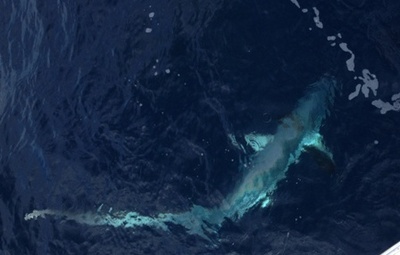 Thresher sharks are almost purple in color with bellies that are silver. They are also not big on posing for the camera and I'm afraid this was the best shot I was able to get. But they are magnificent creatures, fierce fighters and we were all delighted to watch this one swim away.