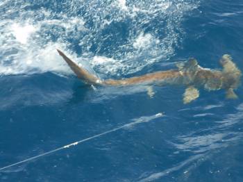 With the Northern current at 1.5 knots, we drifted the 3 baits in 400' for just over an hour and a half. All of a sudden a nice 8' Hammerhead shark surfaced just behind the boat. The Hammerhead shark circled behind the boat searching for the blood and oil scent of the Bonito slab. We were all excited to see this shark spearing and darting left to right in search of the surface bait. The shark quickly found the bait and we were hooked up. 13 year old James hopped in the chair, began fighting the Hammerhead shark. He did a great job and fought the shark for about 30 to 40 minutes. Jackson our mate wired the shark to the boat. After taking a few pictures of the shark and a good look at the awesome looking Hammerhead shark, we used our de hooker to remove the hook and return the shark back to the sea as we do release all sharks.